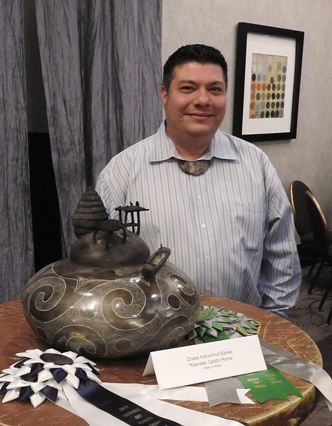 Catoosa, OK — The Cherokee Nation sponsored its 14th annual Cherokee Art Market (CAM) on October 12 and 13, 2019. The market takes place at the tribe’s Hard Rock Hotel And Casino Tulsa. This year, Chase Earles (Caddo Nation) won the coveted Best of Show award Kee-Wat: Caddo Home, a ceramic sculpture featuring a Caddo grass lodge and summer arbor, over a bowl of incised, spiral patterns based on Ancestral Caddo designs. Earles of Ada, Oklahoma, harvested his clay near the Red River, where countless generations of his ancestors gathered clay. He hand-processed the shell-tempered clay and fires it outside to create a study, yet astonishingly lightweight ceramic artwork.