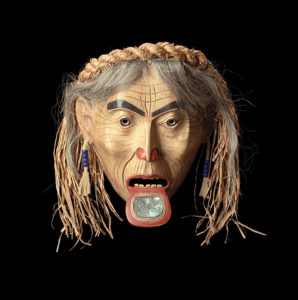 Materials and patterns common in Indigenous artwork were and are integrated into unexpected commodities such as Jamie Okuma’s high heels in Adaption II, Chair with Quillwork Panels (by an unknown Mi’kmaw artist), and Valise, by Nellie Two Bear Gates, as a means to express and maintain Native identities. Beadwork is simulated in Christi Belcourt’s beautiful painting The Wisdom of the Universe, a piece honoring Canadian species listed as endangered or already extinct. As I explored the painting’s detailed patterns, points, and textures of color, I was reminded of the Alaska Native youths, and now youths from across the globe, whose forward-thinking activism is challenging the political moral compass on climate change. They are demanding, as we all must, that we take greater care of their future by decreasing our carbon footprint today.