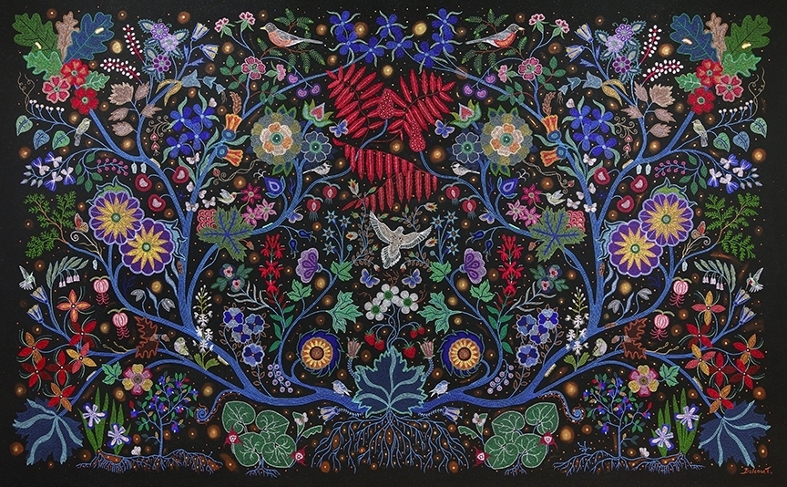 Materials and patterns common in Indigenous artwork were and are integrated into unexpected commodities such as Jamie Okuma’s high heels in Adaption II, Chair with Quillwork Panels (by an unknown Mi’kmaw artist), and Valise, by Nellie Two Bear Gates, as a means to express and maintain Native identities. Beadwork is simulated in Christi Belcourt’s beautiful painting The Wisdom of the Universe, a piece honoring Canadian species listed as endangered or already extinct. As I explored the painting’s detailed patterns, points, and textures of color, I was reminded of the Alaska Native youths, and now youths from across the globe, whose forward-thinking activism is challenging the political moral compass on climate change. They are demanding, as we all must, that we take greater care of their future by decreasing our carbon footprint today.