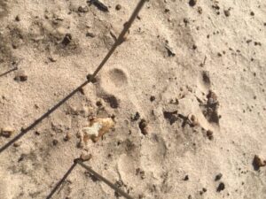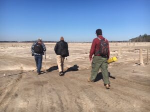 This day, Nate Mountjoy brought the Schonstedt Magnetic Locator to test the “hearth” areas that Guy had found. The locator, a long yellow pole with a small monitor near the handle, is similar to a metal detector, and its eerie hum contributed to the science fiction atmosphere of the drained lake. While two of the sites showed potential, a third had been too damaged by someone doing “donuts” in a four-wheeler – a real problem for the archaeologists who are investigating this site. Looters are also a problem, as the word is out that the lake has been drained. It is against state law to trespass or loot on the property, but that doesn’t stop people from trying.