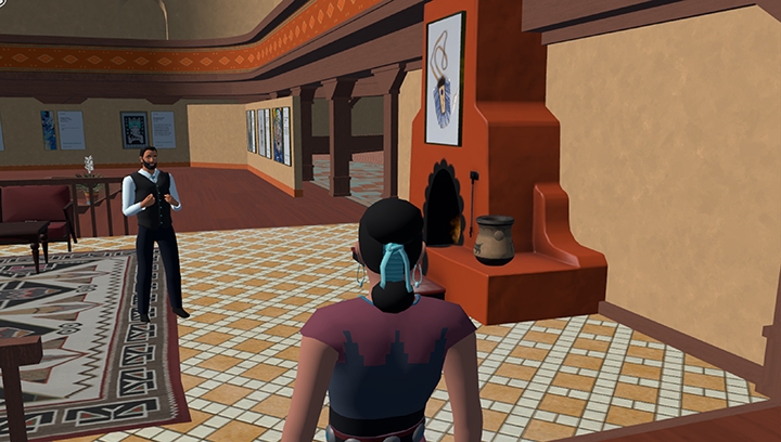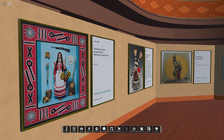 In NDN World, SWAIA members can stroll at their own pace and look at artworks submitted for SWAIA award categories that have been organized by classifications. To learn more about an artwork, just click on its label, and you’ll see the information about it and its maker on your screen. Whether you’re looking at artworks with friends or alone, or if you’re attending the Awards Ceremony, you can enhance what you’re experiencing in NDN World by choosing an emote action to portray a response in real time. You can cry, act surprised, dance, cheer, wave, point, clap, or express love. You can even sit down in a chair or fall over while standing up, if it seems like the thing to do! To add to your reaction, comment right in the moment into your computer’s onboard microphone, and you’ll be heard, as long as your microphone button is set to the on position. But if you’re watching the spoken or video presentations on the convention center’s stage while in NDN World, be aware that your voice carries according to proximity, just like when you’re attending an event at a physical space. You can also peruse the artworks donated by Native artists to the SWAIA Benefit Auction that are on view near the stage.