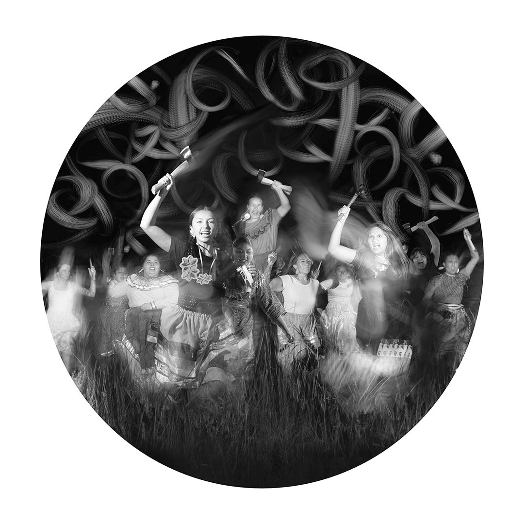 Destiny J. Green (Chickasaw), “Aahíkkiʼya Ano̱wa- Chikasha Ihoo Oksi̱foshiʼ Okcha̱at Billiʼyaʼ / Aahíkkiʼya Again: Chickasaw Hatchet Women Live Forever,” 2024, photograph “painted” with fiber optic light brush. Image courtesy the artist.